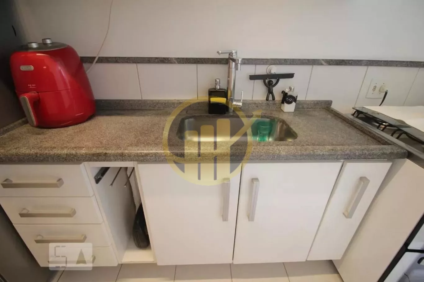 São 2 dormitórios, sendo 1 banheiro, cozinha aberta com cooktop, forno elétrico.