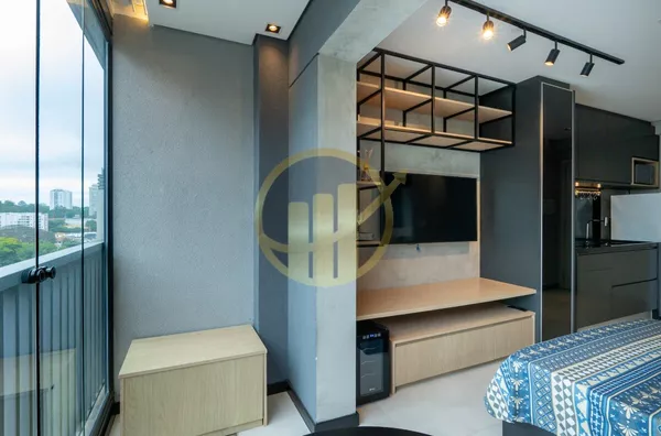 O ambiente é totalmente otimizado, com projeto inteligente de interiores quevaloriza cada metro quadrado. O studio conta com armários planejados de excelente qualidade, ar-condicionadoinstalado, cozinha compacta e funcional, e acabamentos contemporâneos que transmitem elegância e bem-estar. Avaranda possui fechamento em vidro e persianas automatizadas, ampliando o conforto e permitindo o melhoraproveitamento do espaço em qualquer momento do dia. A iluminação natural é outro destaque, criando um ambienteagradável e acolhedor ao longo do dia.